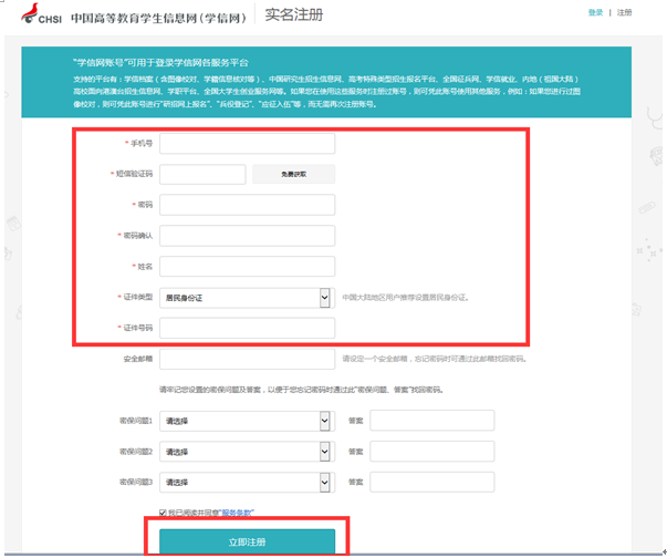 注冊(cè)頁面:只需填寫紅框里的內(nèi)容,必須用學(xué)生本人手機(jī)號(hào)。