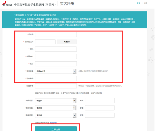 注冊頁面:只需填寫紅框里的內(nèi)容,建議用學生本人手機號。