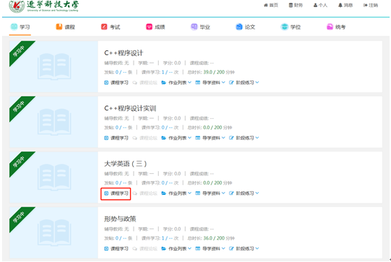 1、登錄后,進(jìn)入主頁面,找到學(xué)習(xí),然后選擇課程學(xué)習(xí)。