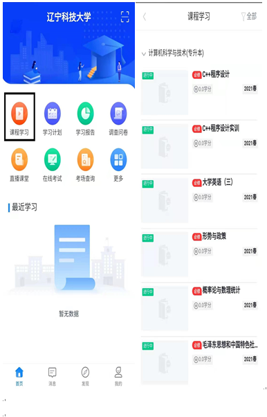 3、選擇課程學(xué)習(xí),進(jìn)入課程界面,2021秋為本學(xué)期要學(xué)習(xí)的課程。