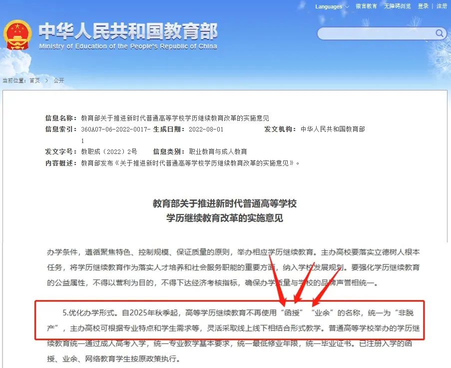 自2025年秋季起,成人高等學(xué)歷繼續(xù)教育不再使用“函授”“業(yè)余”的名稱,統(tǒng)一為“非脫產(chǎn)”。